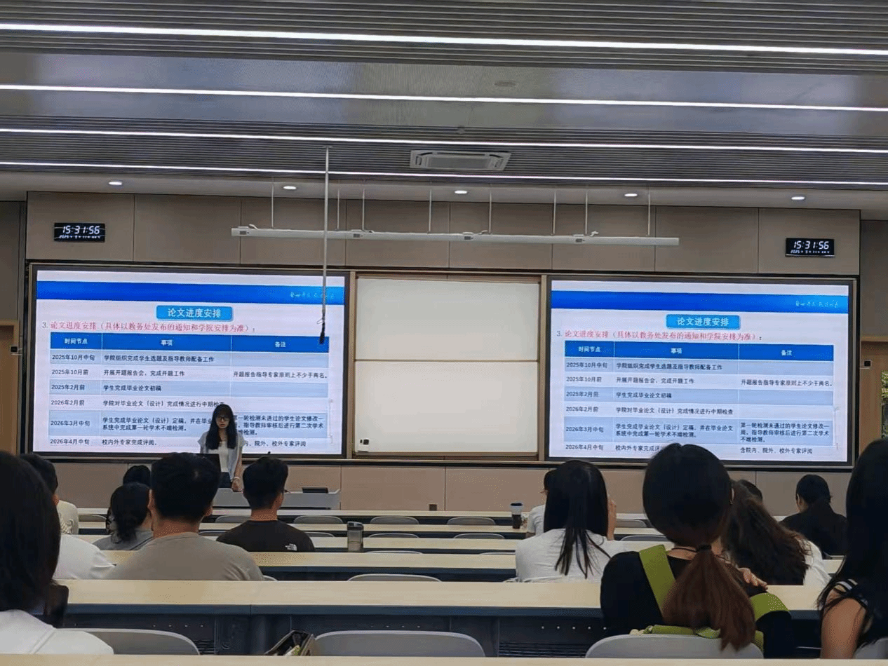 本科生专场在经世楼G102开展。本科教学秘书张洋铭老师介绍了本科生毕业论文相关事宜。毕业班辅导员张杨雪老师分析了学院2025届毕业生就业情况,提醒同学们注意核对生源信息、求职、毕业论文、就业信息填写和毕业派遣等相关事宜,要求同学们严守校规校纪,安全毕业、文明毕业。