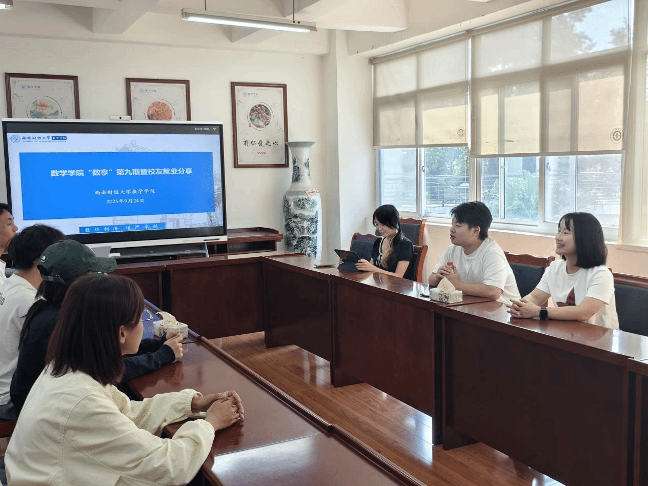 9月24日上午,由西南财经大学数学学院研究生会职业发展部主办的“数享”第九期分享会于通博楼B312室顺利举行。本次活动邀请2022级数学专业校友毛文富学长,围绕“中学教师”求职方向这一主题,为在校研究生带来了一场精彩而深刻的就业经验分享。