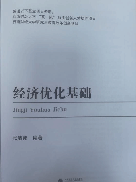 近日,由西南财经大学研究生教育改革创新项目资助,数学学院张清邦教授编撰的研究生教材《经济优化基础》正式出版。该教材的出版标志着学院在推动数学与经管学科交叉融合又取得进展,为研究生课程体系注入了新的资源。