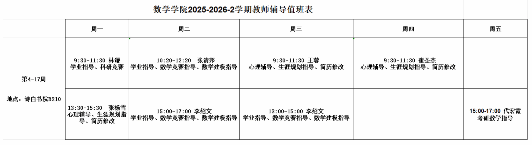 参加辅导的同学请在值班时间到书院B210室即可。非诗白书院的学生请带好学生证,在门口登记后进入。如遇假期,值班暂停。
